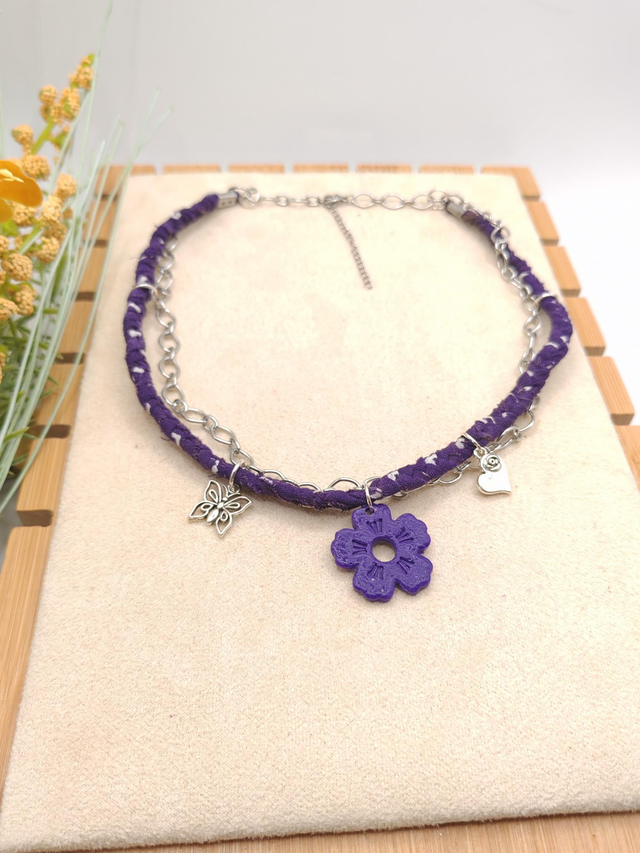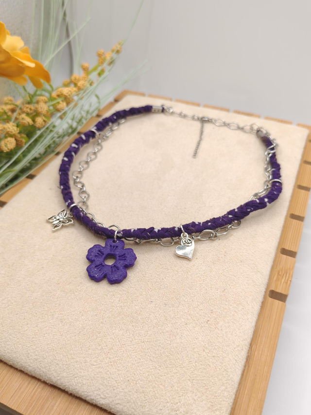 Un bijou unique mêlant douceur artisanale et éclat métallique. Ce collier se compose d’un tissu 100% coton tressé à la main, associé à une chaîne en acier inoxydable pour plus de caractère. Il est orné de pampilles en acier inoxydable et sublimé par les Choupettes Mohana violettes, entièrement faites main en pâte polymère.