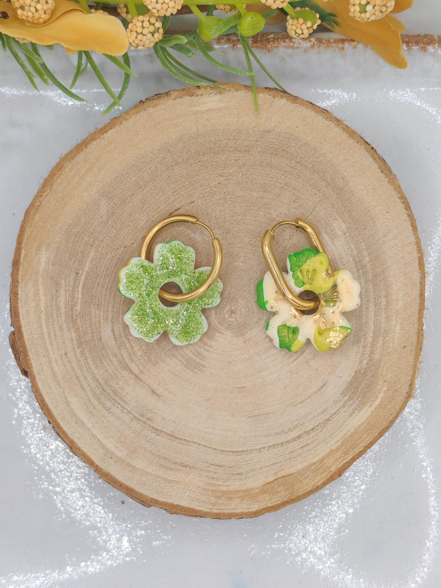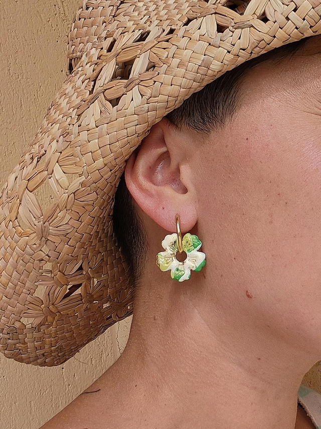 Ces fleurs Mohana rĂ©vĂšlent un motif blanc et vert d’un cĂŽtĂ©, et un cĂŽtĂ© pailletĂ© vert de l’autre. GrĂące Ă  leur effet rĂ©versible, elles s’adaptent Ă  toutes vos envies : naturelles et Ă©lĂ©gantes ou lumineuses et pĂ©tillantes. Une crĂ©ation originale pour illuminer vos oreilles.