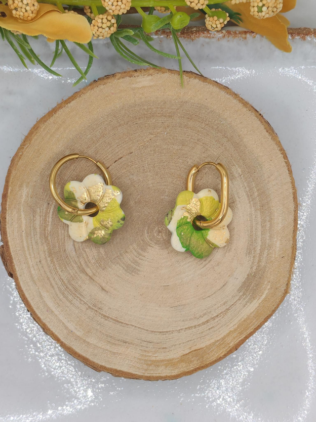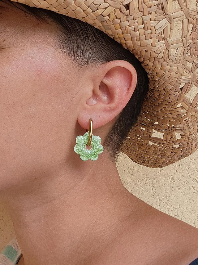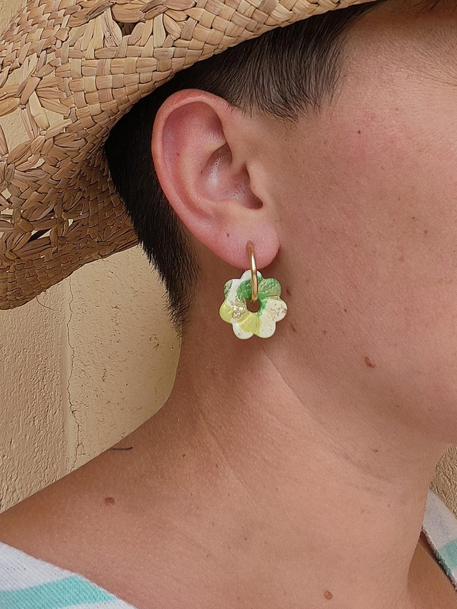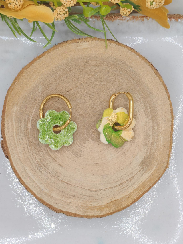 Ces fleurs Nina, petites et lĂ©gĂšres, s’habillent d’un motif blanc et vert d’un cĂŽtĂ©, et d’un cĂŽtĂ© pailletĂ© vert de l’autre. Leur format dĂ©licat est idĂ©al pour les enfants ou pour celles qui aiment les bijoux fins et discrets. GrĂące Ă  leur effet rĂ©versible, elles offrent deux styles en une seule paire.