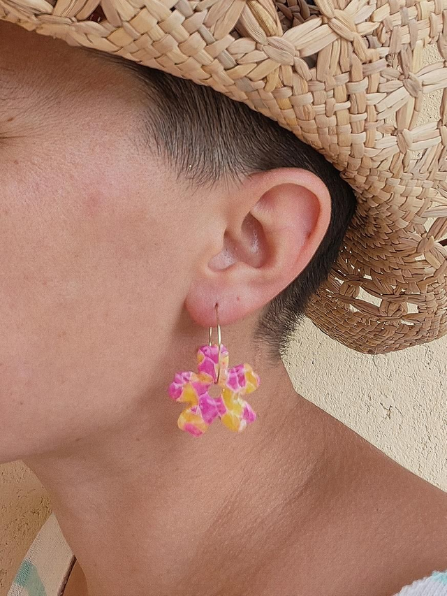 Ces fleurs Île, plus grandes et audacieuses, se parent d’un superbe effet marbré violet et jaune. Une création artistique et lumineuse qui attire le regard et sublime votre style avec originalité.
