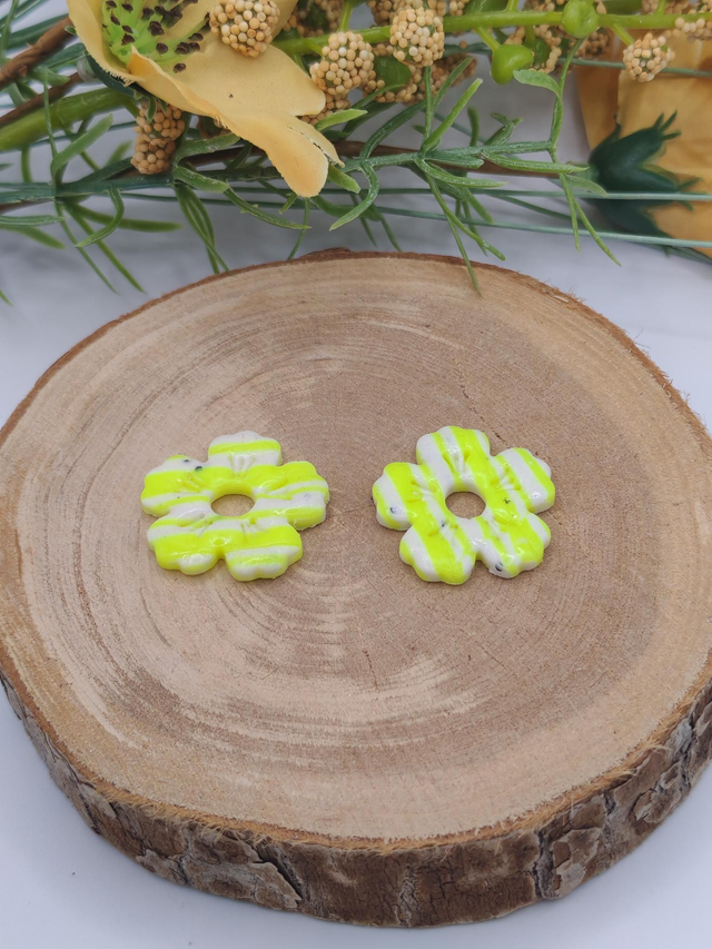 Ces fleurs Mohana rayées blanc et jaune fluo sont idéales pour apporter une touche lumineuse, fraîche et pétillante à vos tenues. Le jaune fluo contraste joliment avec le blanc, et quelques paillettes noires discrètes ajoutent du relief. Réalisées à la main en pâte polymère, elles sont recouvertes d’un revêtement en résine UV pour plus de brillance et de résistance.
