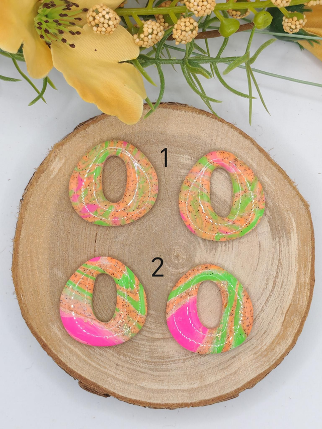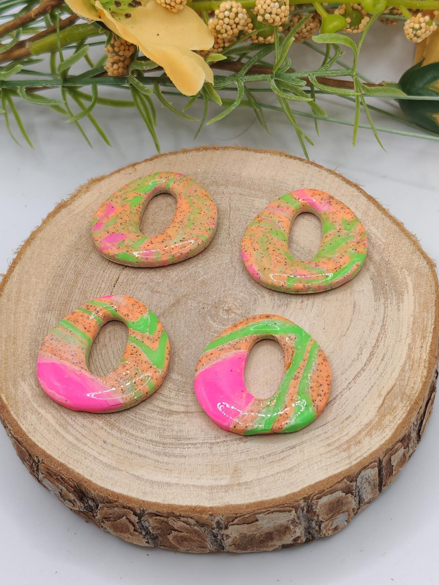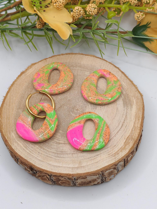 Des couleurs ultra pétillantes pour une paire de boucles d’oreilles pleine de peps ! Ce trio orange, rose et vert fluo crée un effet marbré dynamique et fun, parfait pour affirmer son style.