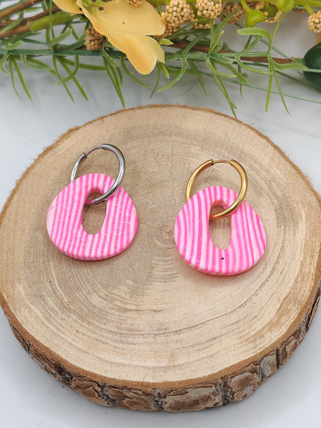 Des Choupettes Rondelettes pleines de pep’s pour apporter de la couleur et du dynamisme à vos boucles d’oreilles ! Ce modèle rayé blanc et rose fluo apportera une touche fun, sucrée et audacieuse à vos looks. Fabriquées à la main en pâte polymère avec un revêtement en résine UV pour plus de brillance et de solidité.