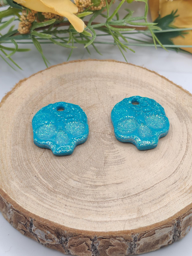 Osez lâoriginalitĂ© avec ces tĂȘtes de mort bleu pailletĂ©es : une touche de fantaisie brillante pour un look affirmĂ© et pĂ©tillant ! FabriquĂ©es Ă la main en pĂąte polymĂšre et recouvertes de rĂ©sine UV pour un fini brillant et solide, elles illumineront vos crĂ©oles avec style.