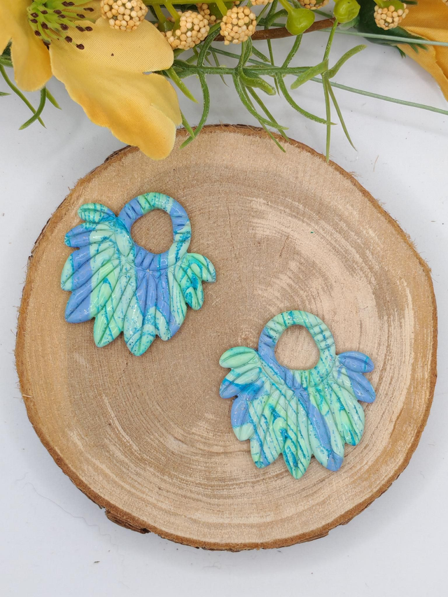 Ces plumes marbrées bleu sont un véritable clin d’œil à la mer et au ciel. Rehaussées de paillettes subtiles, elles captent la lumière avec élégance. Chaque exemplaire est unique, modelé à la main en pâte polymère, puis recouvert de résine UV pour un effet brillant et durable. L'effet marbré associé aux paillettes leur donne un rendu à la fois naturel et enchanteur.