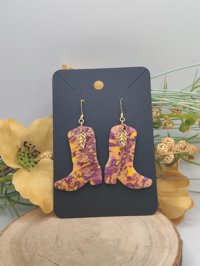 Un duo de couleurs audacieux et ensoleillé pour une touche western originale ! Ces boucles en pâte polymère marient l’intensité du violet à l’éclat du jaune dans une création faite main pleine de caractère.